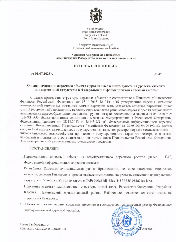 о переподчинении адресного объекта территория Каккарово